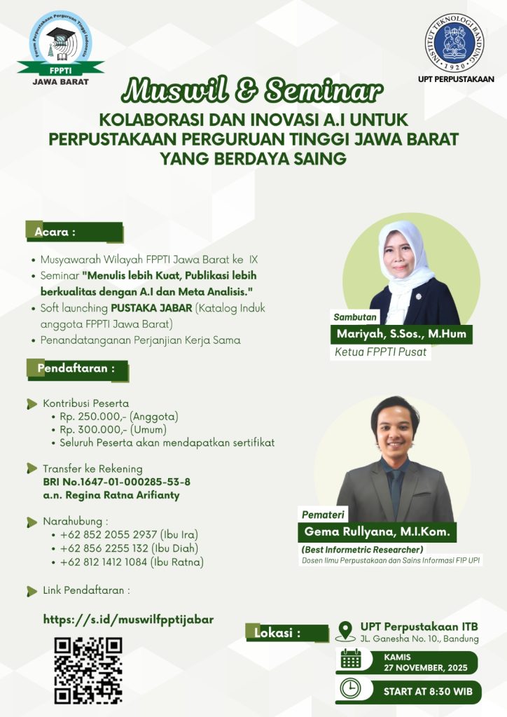 Kami mengundang Bapak/Ibu untuk hadir dan berpartisipasi dalam Musyawarah Wilayah & Seminar FPPTI Jawa Barat ke IX, sebuah forum strategis yang akan menjadi titik balik dalam penguatan kolaborasi dan pemanfaatan teknologi A.I. di lingkungan perpustakaan perguruan tinggi.